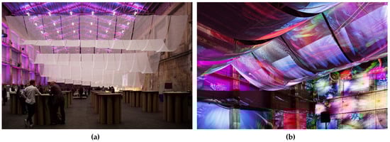 Figure 1) is a temporary lightweight installation made of wide perforated fabric strips hanging from steel cables inside the