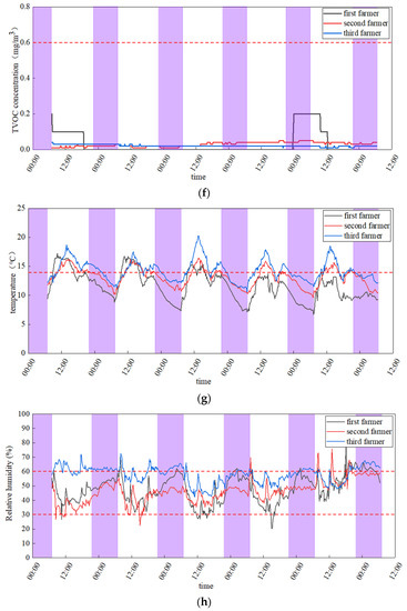 Observing the above curves, it can be found that the changes in CO2, CO, PM2.5 and PM10 concentrations in the bedrooms of the three farmhouses are disorderly, which is caused by the irregular activities of indoor residents. However, in general, there is a common trend, in that there are some peaks exceeding the standard value during the daily cooking period. In addition, many local residents also report that the bedroom often produces a choking feeling of smoke during these periods.