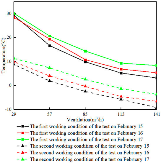 As shown in Figure 5, the results show that the flue gas can preheat the outdoor air from −17 °C~−10 °C to 6 °C~30 °C during the time of burning. When the experiment ventilation volume reached the maximum (141 m3/h), the system raises the outdoor air temperature by 7.2 °C on average. When the experiment ventilation rate was the minimum (29 m3/h), the system could raise the outdoor air temperature by an average of 23.7 °C. In the working period of one hour after the burning stopped, the residual heat in the smoke chamber preheated the outdoor cold air to −6 °C~10 °C.