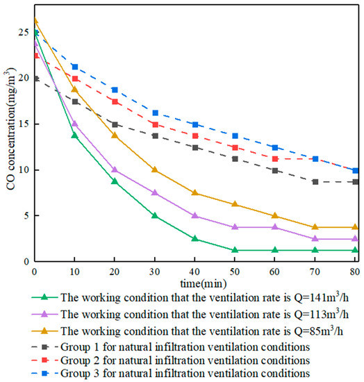 The change in indoor CO concentration of the three groups without any ventilation measures was selected as a comparison, and the curve of CO concentration with time was drawn, as shown in Figure 6. The experiment results show that the combination of mechanical ventilation and external window penetration could effectively dilute indoor air pollutants, and the dilution rate was more than double that of natural penetration. When the ventilation rate was 85~141 m3/h, it only took about 17–30 min to reduce the CO concentration of 20~25 mg/m3 to below the standard value (10 mg/m3).