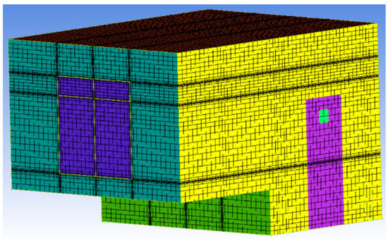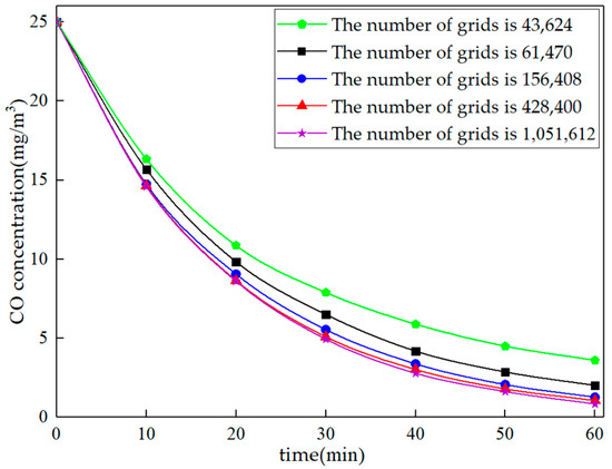 The geometric model is shown in Figure 7. The type of grid is a structured grid. Five sets of structured grid schemes are established to verify the grid independence, and the grid numbers are 43,624, 61,470, 156,408, 428,400 and 1,051,612, respectively. The five schemes are simulated under the test conditions of Q = 141 m3/h. The inlet velocity and temperature are shown in Table 3, the temperature of each wall of the experiment room is shown in Table 4, and the initial CO concentration and initial temperature of the test room are shown in Table 5. The curve of indoor CO concentration with time is drawn as shown in Figure 8. It can be seen from the figure that there is a small difference between the simulation results when the grid number is 156,408 and 428,400, the maximum error is 0.4 mg/m3, and the average error is only 0.3 mg/m3. Therefore, when the number of grids is greater than 156,408, the accuracy of numerical calculation is no longer significantly improved, and 156,408 grids can be used for calculation. The result of grid division is shown in Figure 9.