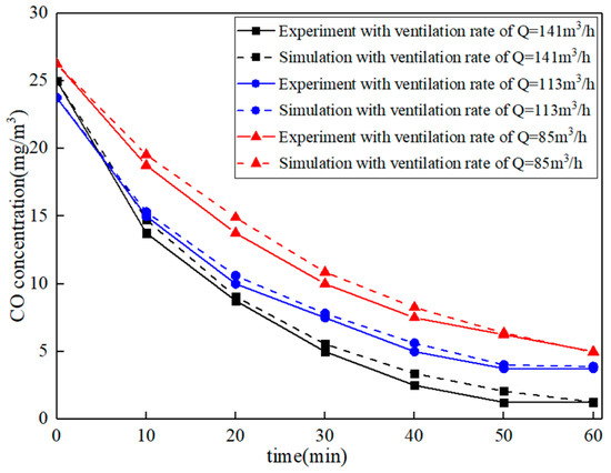 The reliability of the model is verified by experiments with ventilation volume of Q = 141 m3/h, Q = 113 m3/h and Q = 85 m3/h, respectively. The boundary conditions and initial conditions of each test are shown in Table 3, Table 4 and Table 5. The variation curve of the average CO concentration over time at a height of 1.2 m in the room is as shown in Figure 10. It can be seen from the figure that the errors between the simulation result and the experiment are small, of which the maximum error is 0.98 mg/m3, and the average error is 0.53 mg/m3. Therefore, it can be considered that the CFD model established in this study can represent the experimental results.
