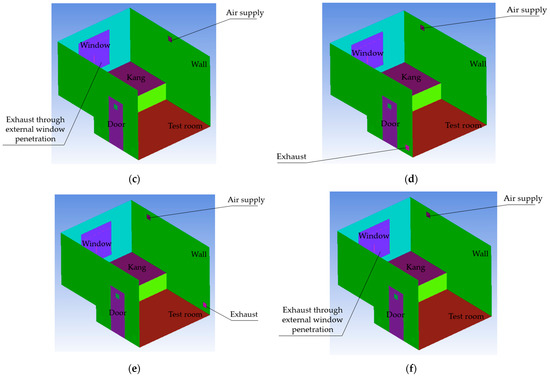 Six layout schemes of air supply and exhaust vents: (a) MOUSLE, (b) MSUSLE, (c) MUSEWP, (d) DOUSLE, (e) DSUSLE, (f) DUSEWP.