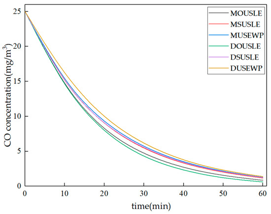 The initial concentration of CO is set to 25 mg/m3, and the data of the Q = 141 m3/h working condition of the above experiments are used as the boundary conditions to simulate the above six air supply and exhaust vents layout schemes. The calculation of average plane CO concentration at a height of 1.2 m in the room in the simulation results, and the CO concentration variation curves with time are as shown in Figure 12.