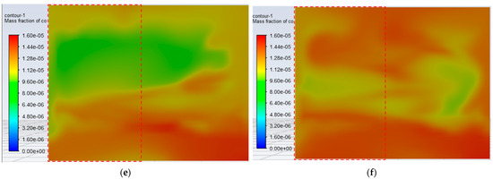 Rural residents spend most of their time on the kang in the bedroom, so the environmental conditions around the kang should be focused. The CO concentration distribution contour is generated by intercepting the plane at a height of 1.2 m, as shown in Figure 13. From the contour, it can be found that when the ventilation mode of DOUSLE is adopted, the CO concentration level in the area where the kang is located is relatively low, and the area with a high CO concentration is mainly on the floor side. When adopting the mode of DUSEWP for ventilation, the CO concentration in the area where the kang is located is relatively high, which may be due to the fact that the air supply port is too close to the external window.