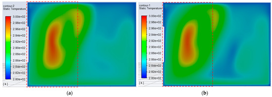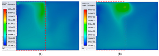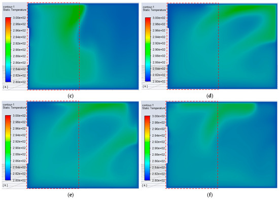 When the air supply volume is Q = 141 m3/h, the supply air temperature is set as 8.4 °C according to the FGFAHE experimental results. The ventilation simulation of the room is carried out in the above six ventilation schemes. The temperature distribution contours are generated by intercepting the plane at the height of 1.2 m in the room, and the area where the kang is located is marked with a red frame, as shown in Figure 14.