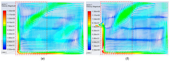 Contours of indoor 1.2 m high plane air velocity distribution under six schemes: (a) MOUSLE, (b) MSUSLE, (c) MUSEWP, (d) DOUSLE, (e) DSUSLE, (f) DUSEWP.