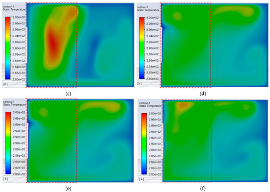 Contours of indoor 1.2 m high plane temperature distribution under six schemes: (a) MOUSLE, (b) MSUSLE, (c) MUSEWP, (d) DOUSLE, (e) DSUSLE, (f) DUSEWP.