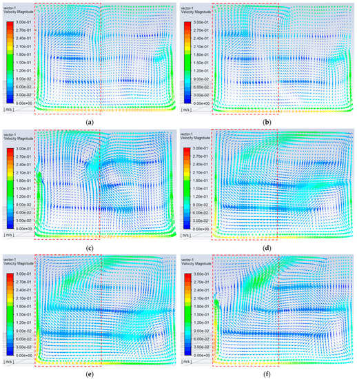 The velocity range in the contours is 0–0.3 m/s. It can be seen from Figure 17 that under the six ventilation modes, there are some areas where the air velocity is higher than 0.2 m/s, but lower than 0.3 m/s, mainly distributed near the inner wall on the south side of the bedroom. Most of the air velocity in the area where the kang is located is lower than 0.2 m/s. Such air velocity would not cause discomfort to indoor occupants. The air velocity of the area where the kang is located and the area where the floor is located is calculated, and a table is drawn, as shown in Table 9. It can be found that the average air velocity in the area where the kang is located reaches about 0.06 m/s. It can be ventilated for a long time in this state.
