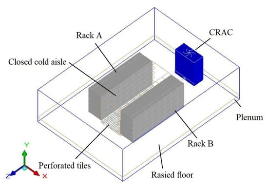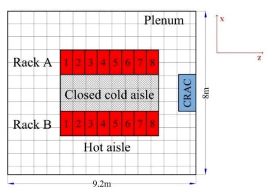 The studied DC, with a total area of around 300 m2, serves in a university to support internet and information services, while it is divided into six different functional areas, including three DC rooms (base, core, and supercomputer rooms) and other functional areas (e.g., monitoring area, uninterruptible power supply (UPS) distribution area, hosting room). In this paper, the base DC room covering an area of 88 m2 is selected as the research object, while the base room simulation model is established totally according to its geometric and physical parameters. This base room adopts a Schneider air-cooled conditioner and under-floor air distribution (UFAD) system with closed cold aisle (CCA) and open hot aisle (OHA). In the base room, CRAC unit supplies cool air from its air outlet to the plenum, while the cool air flows into the CCA through the perforated tiles. Then, the cool air is drawn into the racks, and removes the heat generated by the servers, from where the heated air flows out of the racks and into the OHA, and finally returns to the CRAC unit. Figure 1 shows the layout of the core computer room and the specific parameters of the base room and its equipment are summarized in Table 1 as well as the site photo of the base room, CRAC unit, CCA, racks, and servers. Both sides of the cold aisle adopt the “face-to-face, back-to-back” rack arrangement method to partition the cold and hot air flow from each other.