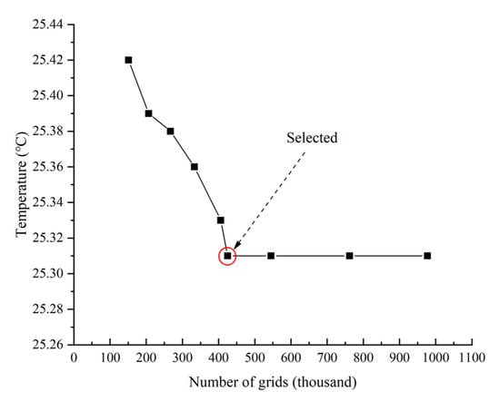 As presented in Nielsen CFD quality control methods [], the independence of the grid should also be checked before the numerical simulation calculation. Figure 3 shows the independent grid test of the original base computer room. After selecting different grid densification levels for the initial DC model, we found that when the number of grids changes from about 420,000 to 970,000, the impact of increasing the grid density on the simulation is very small. Under this circumstance, the grid is tested as independent, and the balance between high accuracy and high efficiency of numerical calculation has been achieved. Therefore, the grid number of 425,081 is selected as the appropriate number. In this case, the maximum grid size in the x, y, and z axis directions is 0.1 m. In the subsequent simulation calculation process of this research, the grid independence test is also carried out. In addition, the quality of the grid is checked by the quality inspection tool that comes with Icepak, while the mesh quality is qualified with the appropriate mesh number.