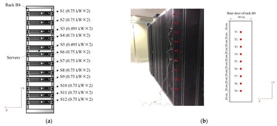 Schematic diagram of the server in the rack. (a) The layout and corresponding specifications of the servers in rack B4. (b) Arrangement and test connection diagram of rack temperature test points.