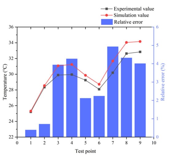 Figure 5 compares the temperature values of the test points between the numerical and experimental results in the base room. The relative error between the experimental and simulation results of each measuring point was below 5%, which is within an acceptable limit, while the temperature of each measuring point in the simulation results is slightly higher than that in the experimental results. These prove that the base room temperatures modeled are reliable and can be used for following further research.
