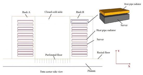 Among all the available cooling technologies applied in DCs, heat pipe (HP) composite cooling is a feasible and promising solution, which can enhance the cooling efficiency for the servers and reduce the cooling demand required. The HP is a new type of high-efficiency heat exchange element, which can efficiently transfer a large amount of heat through a small heat exchange area without external power or only a small external power. When the outdoor temperature is cool enough, free cooling sources can be used to cool the DC with the HP system []. Since the latent heat is hundreds of times the sensible heat, compared with other cooling methods, HP cooling can carry out heat exchange under a smaller temperature gradient on the heating surface, and thus increase the heat transfer rate [,]. In addition, HP cooling avoids the direct contact between the refrigerant and the server, which reduces the risk of internal server leakage and ensures safer system and equipment operation environment []. At the same time, the use frequency of the fans inside the server is reduced, and the noise generated is reduced, which can be controlled below 45 dB [].