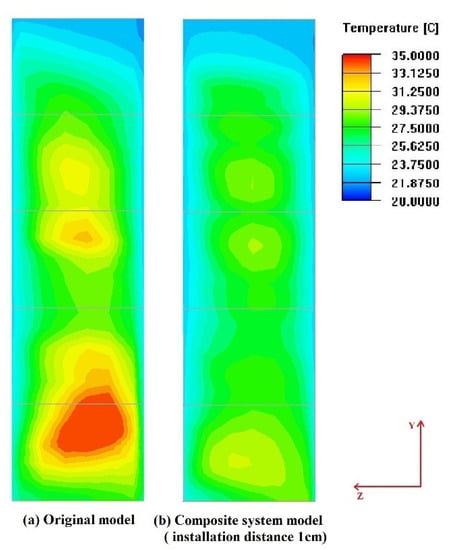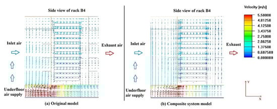 Figure 10 shows the air flow pattern of the rack B4 in the original model and composite cooling model (installation height 0.01 m). In the original model, the air velocity near the bottom of the rack B4 is higher, which leads to lower air flow in the lower part of the rack and makes the air with higher temperature in the hot aisle return to the rack. Under this circumstance, the air distribution is uneven, and heat accumulation occurs. For the composite model, the installation of the HPE occupies the air flow space between the servers to a certain extent, but also changes the flow path of air. The instability of part of the airflow at the inlet is increased, which causes turbulence; heat transfer is also enhanced. Compared with the T-shaped underfloor air duct network system for improving the floor air supply to improve the temperature uniformity, the optimization effect of this composite system on the overall temperature uniformity of the rack is more obvious [].