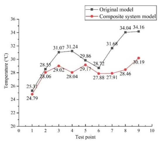Figure 8 shows the profile of heat distribution of the air outlet of rack B4 in the two systems. As shown in Figure 8a, the different server power in the rack results in uneven temperature distribution in the original system. The temperature of the middle and lower parts of the rack B4 is highest, especially at the bottom of the rack B4 where there is significant heat accumulation. As shown in Figure 8b, after installing the HPE above the server in the rack, the heat distribution of the air outlet of rack B4 is more uniform. The heat accumulation in the middle and lower parts has been greatly reduced, and the thermal environment has also been improved. Figure 9 shows the exhaust air temperatures of the 9 temperature recording points of these two cooling systems. It shows that compared with the original model, the temperature of each recording point has been reduced to varying degrees in the composite cooling model. The rack hotspot is reduced from 34.16 °C to 30.19 °C, and the maximum temperature drop is 3.97 °C, while the maximum temperature drop of the composite baffle system is 3.4 °C [], which significantly improves the current situation of excessive local temperature of the rack. It can be seen that the new cooling system has a good optimization effect for hot spots. The standard deviation of the exhaust air temperature recording points in the two models is 2.80 °C and 1.48 °C, respectively, and the value of the standard deviation is decreased by 1.32 °C. As a result, the uniformity of the temperature distribution in the rack is greatly improved, and the thermal environment of base room is significantly optimized.