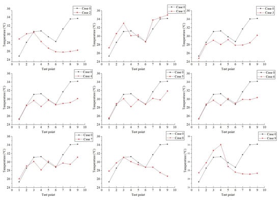 The average air temperatures of the back door in case 0 and cases 9–16.