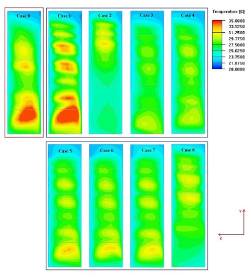 Figure 12 shows the heat distribution profiles of the air outlet in cases 0–8. There is significant heat accumulation in the lower part of rack B4 with case 0. The heat accumulation is the worse in case 1, with slight heat accumulation in the middle and top part of the rack. In case 2, although the lower-part heat accumulation is eliminated, the upper heat accumulation occurs. In cases 3–8, the rack hotspot temperatures have been reduced to varying degrees, and the heat distribution at the upper and lower parts is relatively uniform. Case 3 performs optimally in terms of temperature distribution within the air outlet in rack B4, and the next best performance was observed in case 4. Under this circumstance, the temperature distribution of air outlet is the most uniform, and the temperature of rack hotspot is minimized to 30.3 °C.