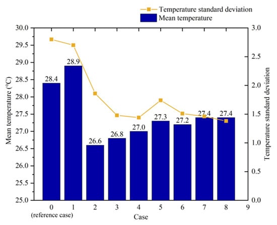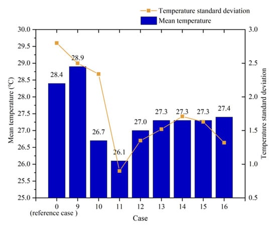 Figure 15 summarizes the standard deviation of the outlet air temperatures of the 9 points analyzed in the original case 0 and the improved cases 9–16. It can be found from the table that the standard deviation of case 11 has the lowest standard deviation: 0.9. The standard deviations σT of all other cases are also lower than that of the case 0. This means that by installing HPEs, the uniformity of the rack air temperature can be improved, and the local overheating of the rack can be avoided. Therefore, given the uniformity of the temperature of the rack B4, in case 11 (0.01 m from the bottom of the server), the temperature distribution of the rack is the most even.