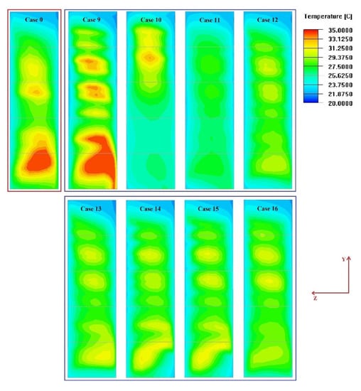 Figure 14 shows the heat distribution profiles of the air outlet in case 0 and cases 9–16. In case 9, the heat distribution in the lower part of the rack B4 is not improved, and the heat accumulation is generated in the middle of the rack, which deteriorates the thermal environment. In case 10, although the heat accumulation of the lower part is eliminated, the heat accumulation of the upper part occurs. Only in cases 11–16, the temperature distribution of each part in the rack has been improved significantly, and the heat distribution at the upper and lower parts of the air outlet is relatively uniform. From the perspective of the temperature improvement and heat distribution uniformity of the back door air temperature of rack B4, case 11 performs better than other solutions. Under this circumstance, the temperature distribution of air outlet is the most uniform of the under-server cases, and the temperature of rack hotspot is minimized to 28.6 °C.