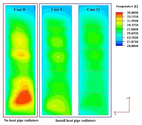 Figure 16 shows the comparison of heat distribution profiles of the air outlet of the rack B4 under three different conditions (no HPEs, HPEs installed 0.01 m above or below the servers). It can be seen from the figure that the optimization effect of case 11 is better than that of case 3. This is because the hardware inside the server is installed at the bottom of the chassis, and HPEs installed below the servers are closer to the heating parts of the server than installed above the servers, so the optimization performance of case 11 is better. With HPEs installed 0.01 m below the servers, the hot spot temperature of the rack is reduced from 37.0 °C to 28.6 °C, and the maximum temperature drop among all recording points reached 6.8 °C. The thermal environment of the base room is greatly improved, and the heat distribution at the air outlet of the rack is the most uniform. Therefore, the composite cooling system with the HPEs installed at 0.01 m below the server is the best cooling scheme in this study.
