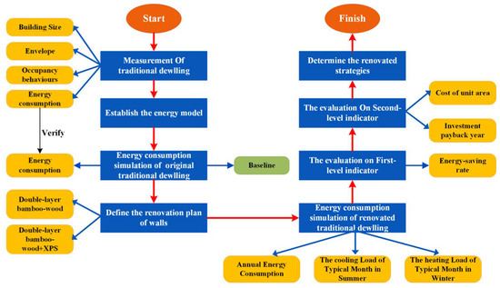 Based on the conceptual framework developed by Ozarisoy et al. [27], this paper proposes a set of evaluation methods for evaluating the suitability of energy-saving retrofitting schemes for traditional wooden walls in wooden structures (Figure 2). First, information and data such as indoor thermal environment of the building, the heat transfer coefficient (HTC) of the wall, and personnel activity were acquired by means of field measurement and investigation, which laid a foundation for the follow-up simulation analysis. Second, modeling and simulation were conducted. To be specific, a simulation model was constructed by combining measured data according to the specific retrofitting measures. Then, data such as cooling energy consumption in summer, heating energy consumption in winter, and annual energy consumption were obtained. Third, the energy-efficient retrofitting work was evaluated. The second-level evaluation indexes were acquired according to energy consumption simulation results and the transformed economic indexes, based on which the optimized energy-efficient retrofitting scheme was given.