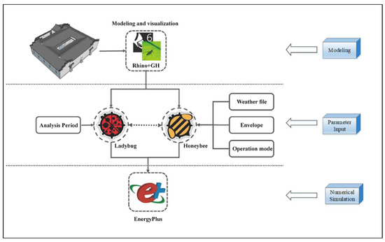 Based on the above measured data, the energy consumption of each room in the traditional dwelling was simulated using energy consumption simulation software (EnergyPlus 9.5.0, the U.S. Department of Energy’s (DOE) Building Technologies Office (BTO), The United States) EnergyPlus. First, a 3D parametric model was constructed with the plug-in Grasshopper of Rhinoceros 3D geometric modeling tool. Then, a battery block engine related to parameters such as indoor building envelopes, electrical equipment, and time in Honeybee and Ladybug was built. Finally, the indoor energy consumption value catering to the practical situation was obtained through simulation (Figure 4). The plug-in Honeybee in Grasshopper was an EnergyPlus-based engine tool, which could quantitatively simulate the energy consumption of all kinds of buildings [28]. The parameters of the simulation project included density, set cooling/heating temperature, composition of building elevation, lighting type and time schedule, and HVAC system. In addition, the input parameters were calibrated through field survey and measurement.
