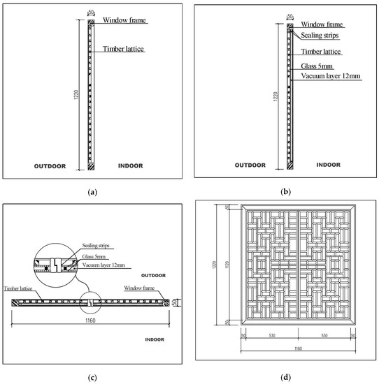 The original window of the building is fixed lattice window without glass. As for window retrofitting, the following aspects are mainly considered: the antique beauty of windows is reserved; the air tightness and thermal insulation performance of windows are enhanced; windows are openable, which is convenient for ventilation. Therefore, the timber lattice is reserved in the window retrofitting, double glazing is installed at the side close to the indoor space, and the thermal insulation effect is reached through the vacuum layer in the double glazing. In addition, a ring of sealing strips is fixed at the outer edge of double glazing to enhance the air tightness of windows (Figure 11). The whole window is transformed into two openable windows, which are connected to mullions using hinges.