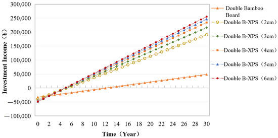 In practical engineering, both energy efficiency and economic cost should be considered, including the labor cost added after energy-efficient retrofitting and the later-stage maintenance cost. Therefore, the research group has fully mastered information such as the price of thermal insulation materials through looking up relevant literature, consulting manufacturers, and conducting market surveys. On this basis, the total cost of each retrofitting measure and the cost of unit area (Table 9) could be further calculated. In actual projects, the total cost of each retrofitting measure is about 1.2–1.5 times that of energy-saving materials [30]. With Table 6 and Table 8 combined, it could be seen that with the increase in the thickness of XPS boards, the energy-saving effect was enhanced accordingly, but the cost of unit area was also increasing. Investment payback period can quantify the returns of each energy-efficient retrofitting measure, and moreover, it can intuitively display the estimated time when the positive returns are reached. Therefore, the investment payback period could be used as a second-level index to comprehensively evaluate the energy-saving effect and the economy of each energy-efficient retrofitting scheme. According to Formula (2), the annual return of each energy-efficient retrofitting measure could be calculated, which was namely the product between the annual energy saved in comparison to the initial energy consumption and the local electricity price. According to surveys, the present electricity price is 0.508 ¥/kwh in Jinhua. Figure 13 displays the annual returns of different energy-efficient retrofitting measures. It could be observed that all the 5 composite thermal insulation materials would begin to generate returns after 5 years. For local villagers, the most suitable retrofitting scheme could be selected according to the energy-saving effect and the investment payback period.
