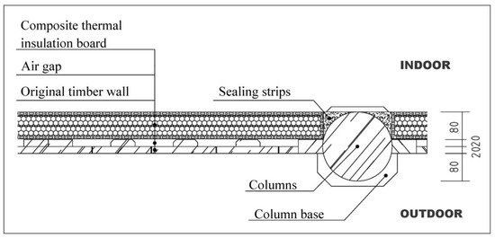During the wooden wall retrofitting of dwellings, the wall thickness allowed to be added for the thermal insulation wall retrofitting is restricted by a lot of factors, remaining to be reasonably evaluated and set according to the wall structure. In addition to improving the energy-saving effect and the indoor thermal comfort, it is also necessary to minimize the impacts of wall retrofitting on the actual indoor use area. In this case, the original planks of this dwelling were arranged along the center line of columns, which were 200 mm in diameter, and a total of three columns were distributed along each wall surface in each room. The internal surface of the plank showed a maximum vertical distance of 80 cm from the structural wooden column, which could be fully utilized in retrofitting, and bamboo-wood composite fiberboard and XPS board composites could be added. Although some indoor area would be occupied in this case, this part of area was not fully utilized in actual use since the locating place of indoor furniture was limited due to the columns protruding out of the wall under the original use status, while the indoor wall surface became smoother after retrofitting. Except the column base, furniture could be located along edges, so the actual spatial use was not impacted. Therefore, the maximum thickness of composites was chosen as 78 mm, with a mounting clearance of 2 mm reserved (Figure 14). During installation, the outer edge of the composite was flush with the outer edge of the wooden column, and rubber beads were used to fill in the joint between the composite and wooden column to prevent water vapor from permeating the room. The retrofitted wall was flat, and its thermal insulation performance was substantially improved. The construction of Chinese traditional dwellings is usually influenced by local construction technologies as well as the construction materials. Since the timber diameter directly decides the column diameter, the thickness of thermal insulation material should be reasonably adjusted according to the wall thickness during wall retrofitting.
