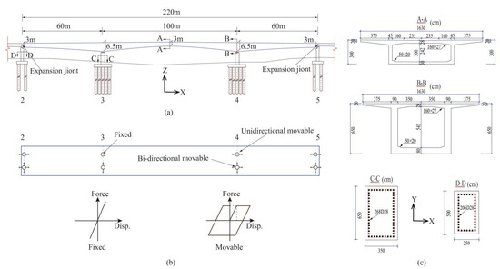 In order to evaluate the isolation effect of continuous girder bridges equipped with LFDs when subjected to near-fault ground motions, the current study adopts a three-span continuous box-girder bridge with typical configurations of girder bridges in China. Figure 6a illustrates the bridge’s elevation with a main and side span length of 100 and 60 m, respectively. The concrete strength of the bridge is 29.2 MPa, and the yield strength of the reinforcement is 345 MPa. The height of the bridge girder varies from 3 to 6.5 m, and expansion joints are installed to accommodate displacement induced by temperature. The original bearing arrangement (Non-isolated) is presented in Figure 6b, including fixed bearing, unidirectional and bidirectional sliding bearings. As a result, the superstructure can freely deform in the longitudinal and transverse directions. Lead rubber bearings (LRBs), due to their high damping properties, are used worldwide [21]. Therefore, in the current study, the comparisons are made between the LRBs system (Isolated-LRB) and the LFDs system (Isolated-LFD) to evaluate the effectiveness of LFDs in mitigating the seismic responses of the bridge under near-fault ground motions. Figure 6c demonstrates the cross-sections of the box-girder and piers.
