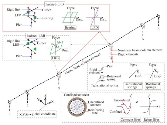 The OpenSees (the Open System for Earthquake Engineering Simulation) [22] platform is adopted to establish the numerical model of the bridge, as can be seen in Figure 7. In the current study, the superstructure is modeled as a spine, and the elastic beam–column element is used to simulate it because the deck is expected to maintain elasticity during seismic excitation. In order to account for pier nonlinearity, fiber sections composed of confined concrete, unconfined concrete, and longitudinal reinforcement are employed to establish piers. The model of Mander et al. [23] is adopted to simulate the confined concrete. Lumped linear springs, including three translational and rotational springs, model the pile foundations. In addition, the pile caps mass is lumped at their centers. Pot rubber bearings are used for the original bearing system (Non-isolated), and the bearing arrangement can be seen in Figure 6b. For the lead rubber bearing system (Isolated-LRB), the bearings in piers 3 and 4 are replaced with LRBs, as shown in Figure 7. Based on the vertical load capacity of LRB, the elastic stiffness (K1), post-yield stiffness (K2), and characteristic strength (Qd) of LRBs are set to 30,000 kN/m, 4500 kN/m, and 771 kN, respectively. For the linear friction damper system (Isolated-LFD), the bearings in pier 3 and 4 are replaced with bidirectional movable bearings and LFDs, as seen in Figure 7. In the current research, the ground motions excite the bridge only in the longitudinal direction, and the other two directions are not considered.