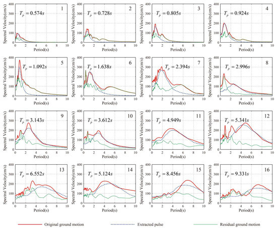 To evaluate the directivity effects on the seismic responses of the prototype bridge, sixteen ground motions with velocity pulses were selected from the Pacific Earthquake Engineering Research Center database in the current study, as seen in Table 1. The magnitudes and pulse periods in Table 1 are varied from 5.8 to 7.62 and from 0.57 to 9.33 s, respectively. The original ground motion refers to a linear combination of two orthogonal components of a ground motion in the strongest velocity pulse direction. In the present study, the procedure developed by Baker [24,25] was adopted to extract the largest velocity pulse from an original ground motion. This procedure mainly contains two steps: First, Daubechies wavelet of order four is adopted to calculate the wavelet transform coefficients of the two orthogonal components of a ground motion, and the sum of the squares of these two coefficients sequences is compared to determine the largest velocity pulse direction. A linear combination of the two orthogonal components in the largest velocity pulse direction yields the original ground motion. Second, wavelet analysis is performed for the original ground motion to extract the largest velocity pulse, and the details are referred to in [24]. The peak ground accelerations (PGA), peak ground velocities (PGV), and pulse periods (Tp) in Table 1 correspond to their original ground motions, as discussed previously. Figure 8 presents the largest velocity pulses extracted from the ground motions in Table 1, and these pulses are characterized by different shapes, peak ground velocities, and pulse periods. Thus, Daubechies wavelet of order four can effectively extract velocity pulses from ground motions. Figure 9 illustrates the velocity spectra of the original ground motion, extracted pulse, and residual ground motion for ground motions in Table 1. It can be found that velocity pulses possess long periods. In addition, the pulse periods are not always consistent with the maximum spectral periods of the original ground motions. For instance, the pulse period of the 13th ground motion in Table 1 is larger than its corresponding maximum spectral period of original ground motion. Therefore, it is more reasonable to determine pulse period from the aspect of time–frequency than from the view of frequency. In the current research, the original ground motions in Table 1 are applied to the longitudinal direction of the prototype in the following sections.
