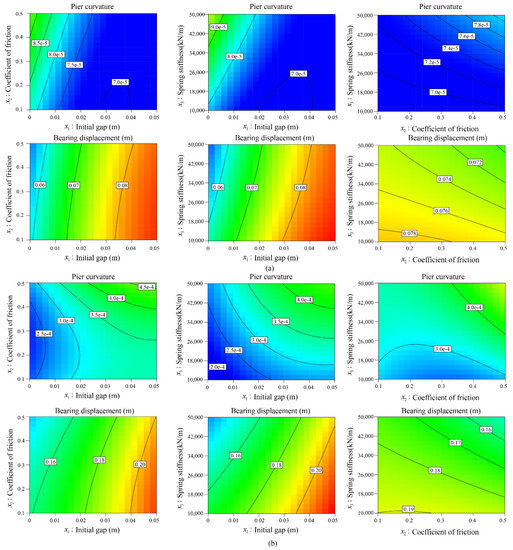 Contour maps of maximum pier curvature and bearing displacement with respect to the variables of initial gap (x21), coefficient of friction (x2), and spring stiffness (x3) of LFD: (a) wave 1 and (b) wave 7 in Table 1.