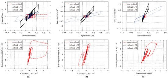 Figure 11 illustrates the force–displacement relationships of the bearing and pier of the prototype bridge with the original system (Non-isolated), LFD system (Isolated-LFD), and LRB system (Isolated-LRB) for waves 4, 9, and 14 in Table 1. For the original system (Non-isolated), the elastic perfectly plastic material is adopted to simulate the force–displacement relationship of the sliding bearing. The bearing starts to move when its friction force reaches a critical value. Meanwhile, for the LFD system (Isolated-LFD), the bearing system’s constitutive model comprises two parts: sliding bearing and LFD. In addition, for the LRB system (Isolated-LRB), the bearing yields when the shear force reaches the characteristic strength (Qd) of the bearing. It can be found that the LRB system (Isolated-LRB) usually experiences a larger bearing displacement than the other two systems. This phenomenon can explain that for the LRB system (Isolated-LRB), the second stiffness (K2) of the LRB bearing is much smaller than its initial stiffness. When a ground motion with a strong velocity pulse excites the bridge in the longitudinal direction, the small post-yielding stiffness of the LRB bearing cannot control the relative displacement induced by a large velocity pulse. Meanwhile, the LFD system (Isolated-LFD) can provide large constant stiffness in the loading process. Thus, the relative displacement between the superstructure and the substructure of the bridge can be effectively controlled.