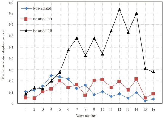 Figure 12 presents the bearing displacement time histories at pier 4 for the original system (Non-isolated), LFD system (Isolated-LFD), and LRB system (Isolated-LRB). It can be observed that large displacement pulses occur for all systems. This is because the large displacement caused by ground motions with velocity pulses must be undertaken either by the superstructure or the substructure. For the original system (Non-isolated), this displacement is taken by the pier with a fixed bearing. In contrast, for the isolation system (Isolated-LFD, Isolated-LRB), this displacement is accommodated by LFD and LRB. The relative displacement between the superstructure and the substructure of the LRB system (Isolated-LRB) is usually larger than that of the LFD system (Isolated-LFD). Moreover, the explanation of this phenomenon can be found in Section 5.2. Figure 13 shows the maximum bearing displacement at pier 4 for the original system (Non-isolated), LFD system (Isolated-LFD), and LRB system (Isolated-LRB) with 16 ground motions in Table 1. For the LRB system (Isolated-LRB), the large relative displacement between the superstructure and the substructure frequently occurs, and this large displacement far exceeds the allowable displacement of LRB (0.3 m). As a result, pounding and unseating of the superstructure of the bridge will happen under ground motion with strong velocity pulses. Meanwhile, LRBs are expected to experience severe damage. However, the maximum bearing displacements for the LFD system (Isolated-LFD) can be effectively controlled.