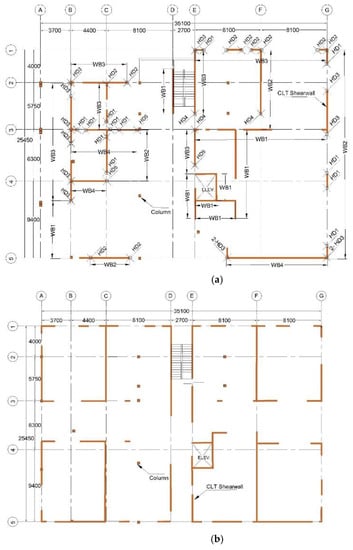 Due to its biaxial strength and stiffness, CLT can be used for floors and shear walls applications in lateral load resisting systems (LLRS), for both platform-type and balloon-type constructions [,,]. In platform construction, each floor acts as a platform for the floor above, in contrast to balloon construction, where walls continue over several floors.
