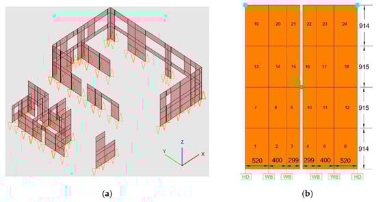 Numerical models: (a) case study building; (b) the balloon shear wall (unit: mm).