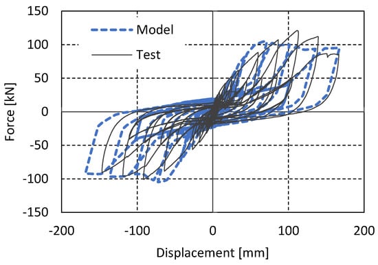 Test results of balloon-type CLT shear walls [] were used to validate the modeling approach. In the shear wall model (Figure 2b), two HDs were modeled on the outer ages of the shear walls calibrated with WHT740, 38–4Ø × 60 test data. Four angle brackets, two on each panel, were modeled and calibrated with angle bracket 200, 30–4Ø × 60. Moreover, a vertical connection was modeled between panels representing panel-to-panel spline connections. CLT wall panels were modeled with a thickness of 191 mm and defined as elastic isotropic material with modulus of elasticity of 9500 MPa, and Poisson’s ratio of 0.01. A 20 kN/m vertical gravity load was applied at the top of the wall, the same as the test setup. A lateral load was applied at the top left corner of the wall panel. The horizontal deformations were then determined at the top-right corner of the shear wall, the same as the test. Figure 4 shows the reversed cyclic load-deformation response of balloon shear wall numerical model which well captured the hysteresis behavior of the test result.