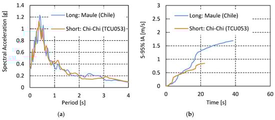 To address this challenge, Zengin et al. [] presented a method where the rate of energy build-up of ground motions was used as a control parameter in addition to amplitude and frequency content. The rate of energy build-up in the accelerogram affects structural response, and accelerograms that quickly reach their final energy are more likely to damage and collapse structures []. The rate of energy build-up of ground motions can be determined by the slope of Husid plots [], based on the rate of Arias Intensity (IA) build-up over the significant duration. Bommer et al. [] compared two records with an equal amount of energy but different durations indicated that the record with a steeper slope of Husid plot imposed higher energy dissipation demand.