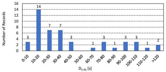 The duration of ground motion was classified based on their 5% to 95% significant duration (D5-95): the time interval between 5% and 95% of the IA, which determines the intensity of shaking by measuring the acceleration of seismic waves [,]: