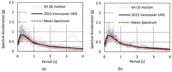 In this study, the Zengin et al. [] methodology was applied to isolate the duration from the amplitude, frequency content, and rate of energy build-up of the ground motion. This was achieved by selecting long and short duration record pairs that have similar spectral shapes and slopes of the Husid plot. For this purpose, first, long duration records from the S2GM [] database were scaled and spectrally matched to a uniform hazard spectrum (UHS) for Vancouver, BC, Canada (2% probability of exceedance in 50 years) with Class C soil condition over a period range of 0.15 T to 1.5 s, where T is the fundamental period of the building. Next, each long duration motion was used as a target spectrum for the PEER NGA-West2 [] database to select a corresponding short duration record with an inherently similar response spectrum.