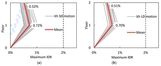 The response of the building subjected to the two sets of records was calculated using unidirectional NLTHA at design intensity level. Figure 8 shows the IDR of first (1F) and second floor (2F) of the building’s long direction. The mean maximum IDR for the two record sets is close to 0.7%, which is well below the 2% drift limit specified in the 2015 NBCC for high importance buildings. The IDR of 1F under SD motions ranges from 0.51% to 1.03% with standard deviation 0.13%. However, IDR of 1F under LD motions ranges from 0.46% to 0.95% with standard deviation 0.11%. The difference in the mean maximum IDR under the two sets of motions at the design intensity level is only 0.02%. This is consistent with the results from previous studies conducted on concrete and steel frame structures [,,] that duration effect on drift at design intensity level was negligible.