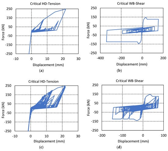 It should be noted that there is no defined or observed collapse drift limit for balloon-type CLT buildings. Therefore, in this study, the collapse under each record is considered to occur when the building experiences lateral dynamic instability. The nonlinear behavior of a critical HD and WB under all the records at collapse and before collapse were evaluated. Figure 9 shows exemplarily the nonlinear behavior of a critical HD and WB under a SD (Imperial Valley-06-Brawley Airport) and a LD (Tohoku-Japan at Koga station) record (red highlighted circles in Figure 9) before collapse. These results show the critical connections performed at onset of collapse (black dots in Figure 10); however, at the next intensity level, they failed, resulting in building lateral dynamic instability.