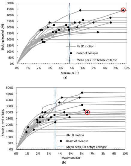 Figure 10 illustrated the IDA curves for the building model subjected to long and short duration motions, at different intensity levels in the weak direction. Each black dot on the curve represents the onset of collapse, which means the building will collapse at the next intensity level. At the design intensity level (100% of UHS), the maximum IDRs were less than 1% under both sets of ground motions. However, with the increase of intensity, the influence of duration was observed. The IDA curves indicated that the estimated IDR for SD motions ranges from 2.2% to 9.7% whereas the IDR for LD motions ranges from 0.9% to 6.5%. Moreover, the SD motions reach an average maximum IDR of 4.8% before causing collapse. In contrast, the LD motions reach an average maximum IDR of 3.6% before collapse. This shows that LD motions are more likely to cause overall instability which will lead to collapse of the building. This finding is in agreement with recent studies on a steel moment frame [] and light-frame wood buildings [,].