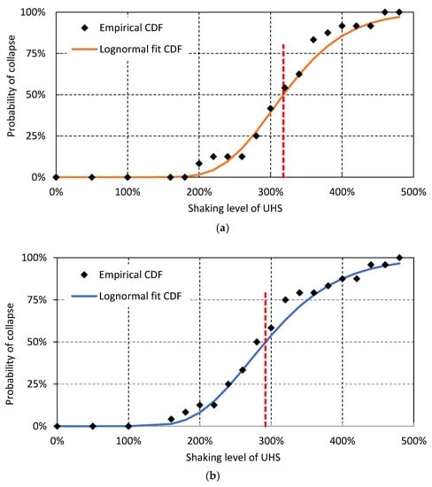 To calculate the collapse risk of the building, collapse fragility curves were derived from the IDA. Figure 11a,b show the fragility curves for the two sets of motions. In this figure, the black dots refer to the empirical collapse data points and the red line is the CDF by fitting a lognormal distribution through these empirical points. The building had 0% probability of collapse at the design intensity level under the two sets of motions. However, with increasing intensity, the building starts to exhibit a higher probability of collapse under LD motions. The median collapse capacity (50% probability of collapse) for LD motions was determined at 292% of UHS intensity level. In contrast, the median collapse capacity for SD motions was determined at 318% of UHS, a reduction in the median collapse capacity of 9%. These results show that ground motion duration affects the collapse risk for CLT buildings. The conclusion that ground motion duration reduces the median collapse scaling level of structures is consistent with the findings for steel or concrete moment-resisting frames and on wood frame buildings [,,,,,,].