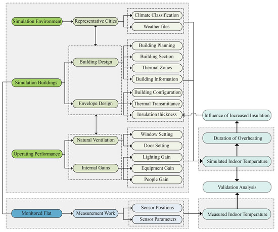 The study examined the indoor operative temperature and duration of overheating during summer (from May to September) in flats constructed with different thicknesses of thermal insulation. Based on measurement data of a newly built flat, groups of validated simulations were carried out to examine the influence of increased insulation on overheating in the regions. The framework of the study is shown in Figure 1.