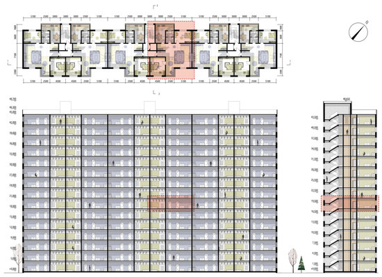 A newly built 15-storey residential building located in Harbin (IIB sub-region city) was selected to study the influence of increased insulation on overheating. Following the building energy efficiency standards in the severe cold and cold regions, the building was constructed with double-glazed windows and well insulated with an extruded polystyrene layer of a thickness of 100 mm. As a typical newly built residential building in the regions, there are three units, namely, six flats on each floor. One unit consists of two flats on each floor with a similar plan, including a living room (facing south) and two bedrooms (one facing north, the other south). According to the field investigation, there was an unoccupied flat on the 7th floor; the other flats of the building were in normal use (either occupied or used for the building operation). There was no ventilation or internal thermal gains in the unoccupied flat during the summer (May to September) of 2021. The other flats were all predominantly naturally ventilated during this time, and air conditioning was not used. Layout and section of the case study building are shown in Figure 2. The detailed architectural design information of the building is presented in Table 2.