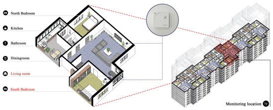 In the field study, the unoccupied flat on the 7th floor of the residential building was monitored during the summer (from 1 May to 30 September) of 2021. The indoor dry bulb temperature of the flat was measured every hour in the living room and south-facing bedroom by Ubibot-DS18B20 sensors, with measuring capacity ranging from 10 °C to 55 °C and an accuracy of ±0.3 °C. The sensors were situated on the wall at a height of 1.1 m above the floor out of direct sunlight, as shown in Figure 3. In total, 3672 data points were collected of the hourly indoor operative temperature in each room of the flat.