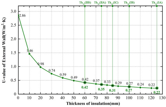 Thinsulation and corresponding U-value of external wall (the values denoted by dark-green circles were applied in the simulation, while those denoted by light-green circles represent values in the current practice standards).